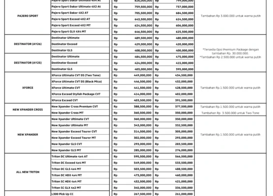 PRICELIST KENDARAAN MITSUBISHI JAWA TENGAH & DIY NOVEMBER 2022 MODEL TYPE HARGA NEW PAJERO SPORT NEW PAJERO SPORT DAKAR ULTIMATE 4X4 AT 728.000.000 NEW PAJERO…